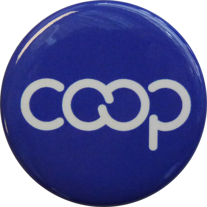 1.5″ digitally printed round Co-op buttons, laminated with safety pin backing.