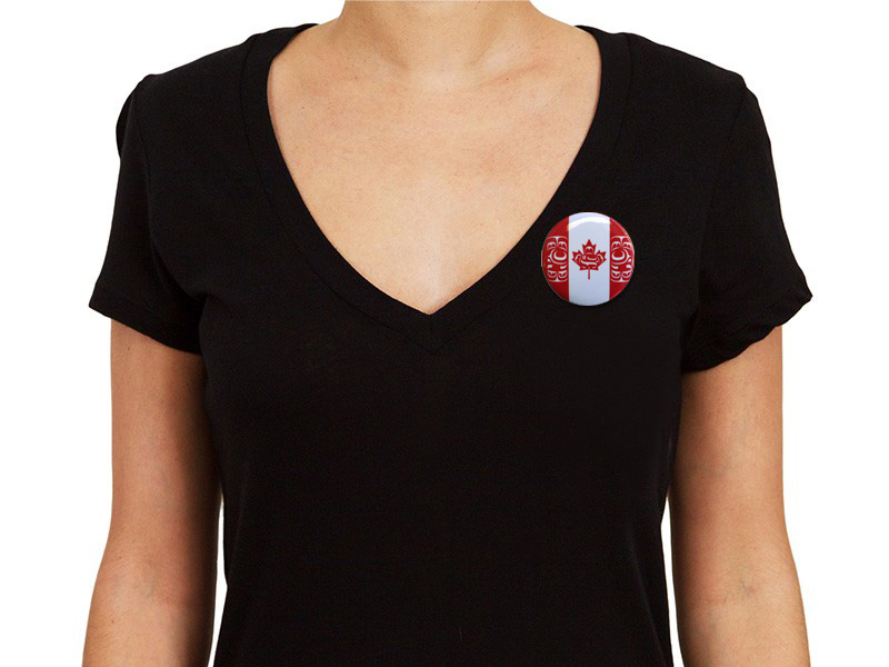 1.5″ digitally printed round “Canadian Indigenous Flag” (formerly the Canadian Native Flag) buttons, laminated with safety pin backing.