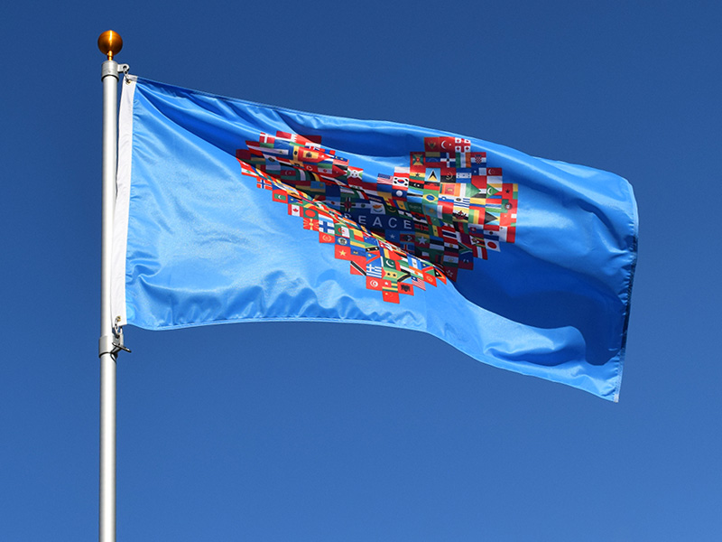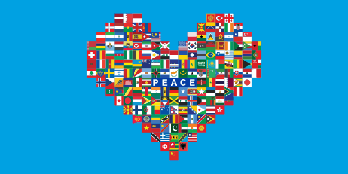The heart shape is made up by international country flags, with the wording “PEACE” in the centre.